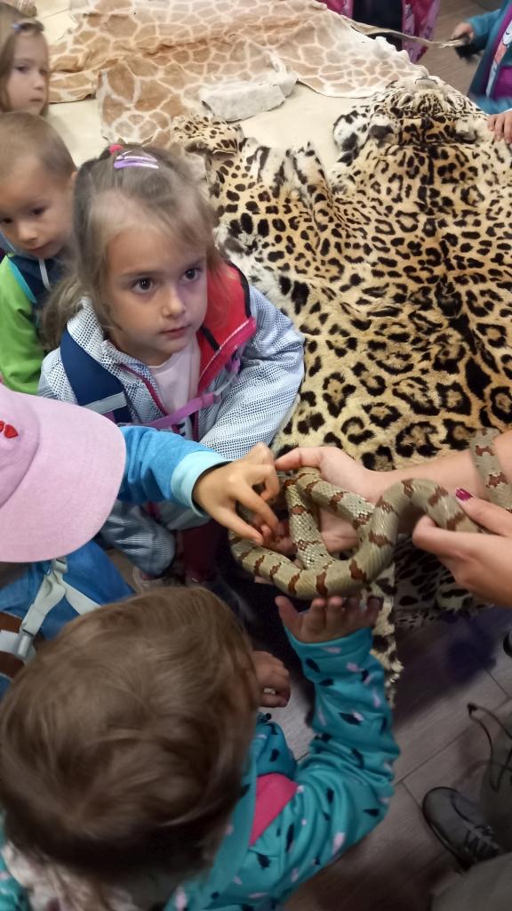 Ale i tak se nám výlet vydařil. Děti si mohly pohladit živou korálovku a agamu, viděly, jak světélkuje štír. Vyzkoušely hebkost kožíšků žirafy a levharta, drsnost parohů soba, křehkost vysvlečené kůže hada...